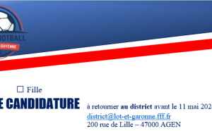 Envoyer votre candidature (nom – prénom – club – numéro de licence et petit texte de motivation) par mail à l’adresse suivante : district@lot-et-garonne.fff.fr